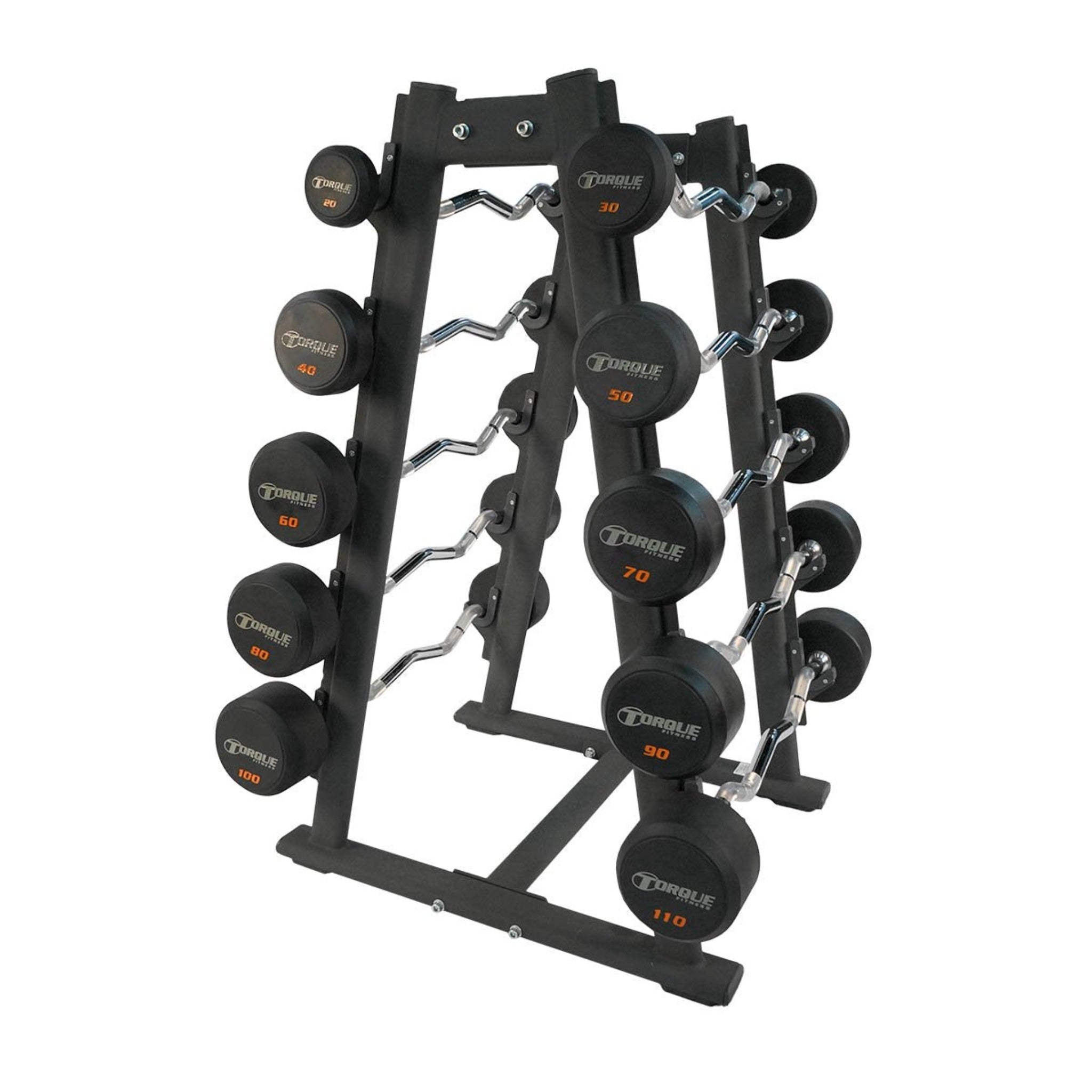 Torque ergonomic easy-curl barbells feature solid-steel machined heads with durable rubber coated ends. Highly visible weight designations are laser engraved into the one piece molded ends. The hard chrome finish bars are precision knurled with a diamond pattern. Barbells are available in a 650 lb set that includes 10 bars in 10 lb increments. Note: Barbell Rack is available but not included in this package. Weights: